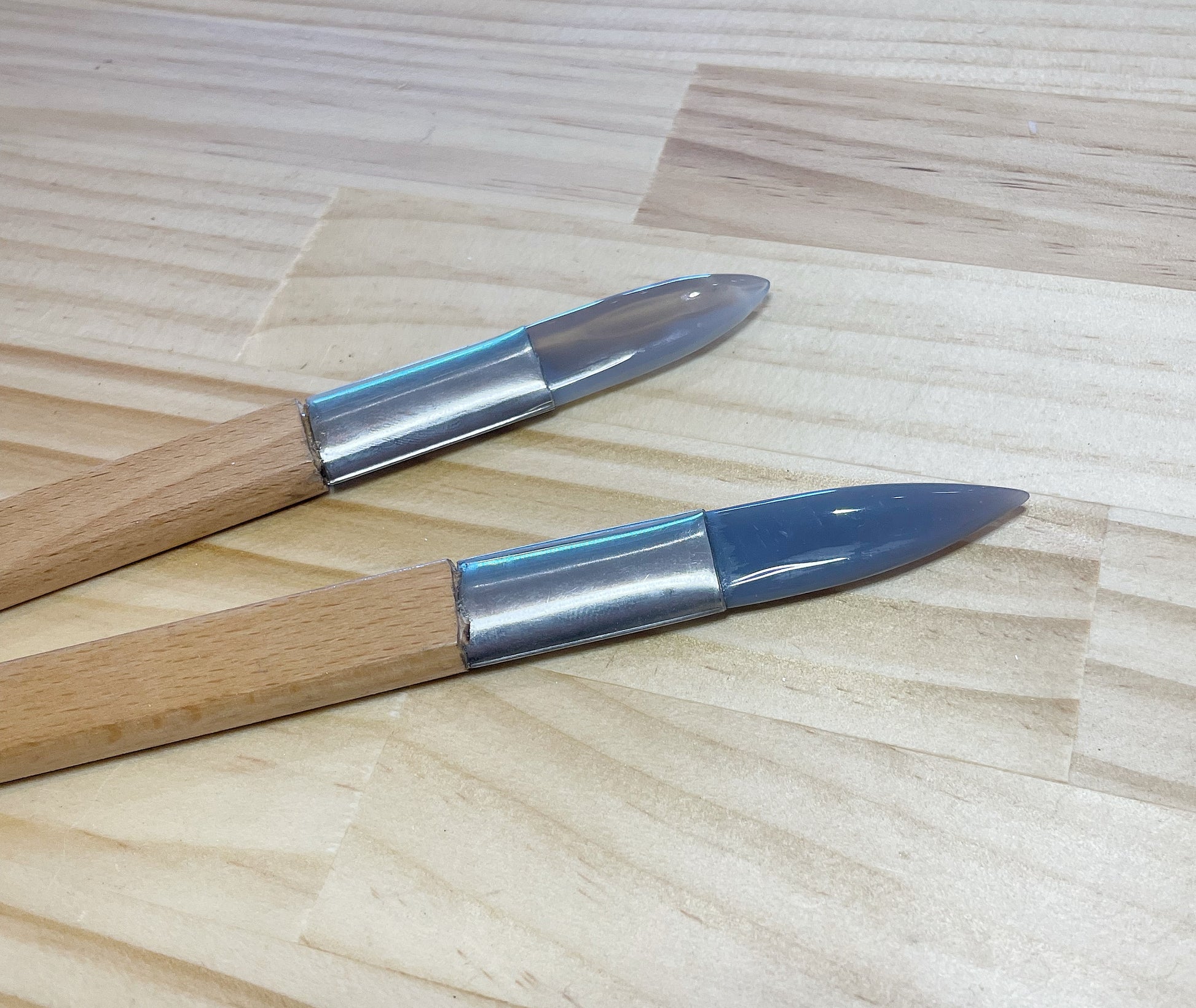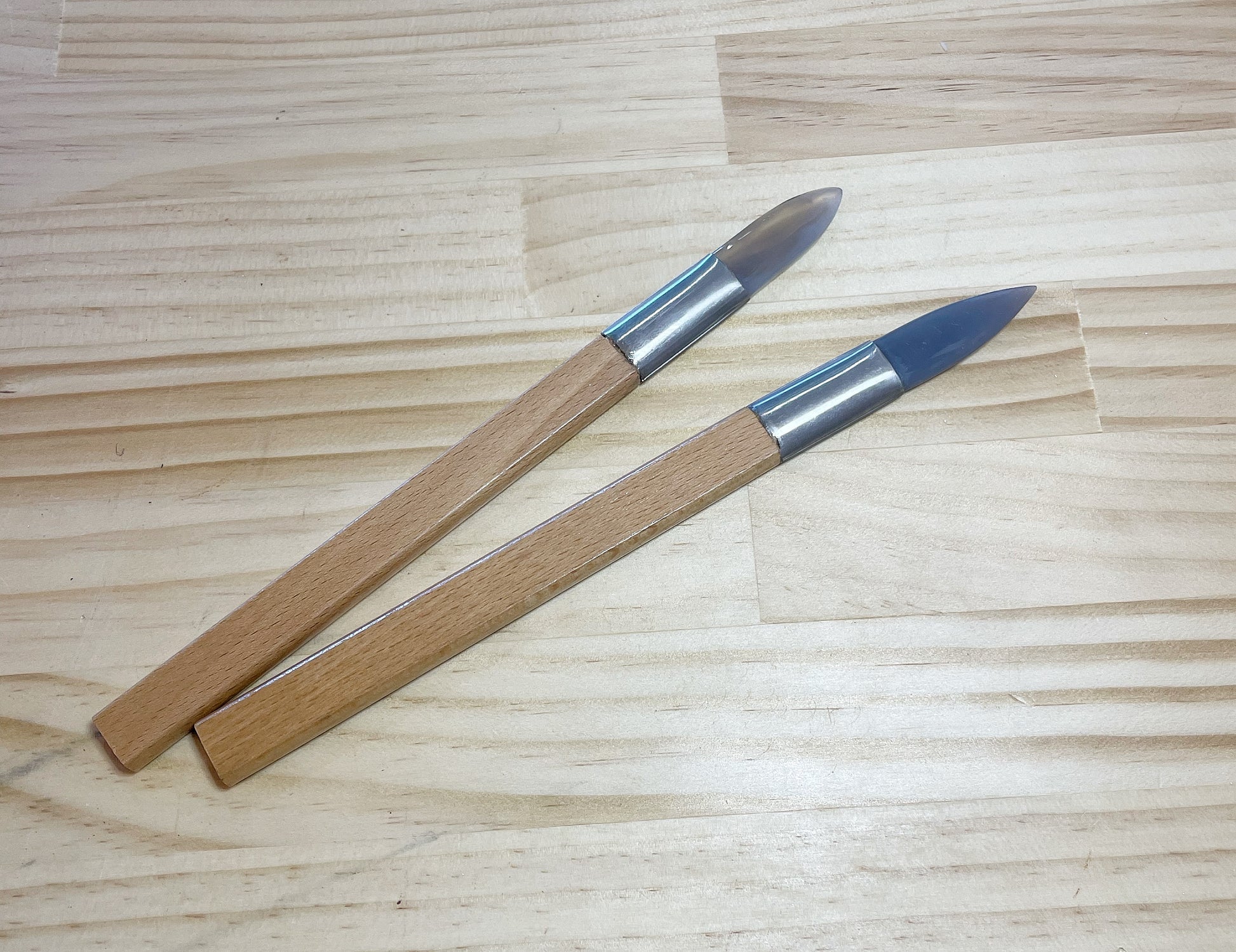 These beauties are crafted from natural smooth agate and a comfortable wooden handle. Due to the nature of natural stone each burnisher is unique in its coloration and shape. Please avoid dropping your burnisher as the tips can break if not handled with a little caution.