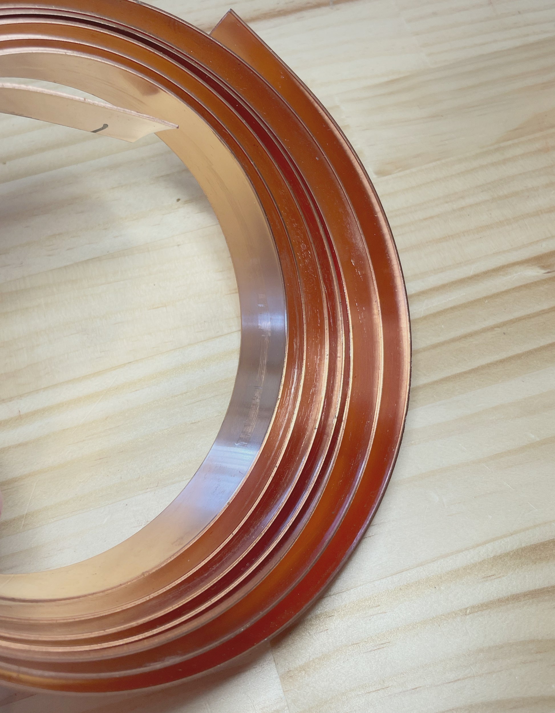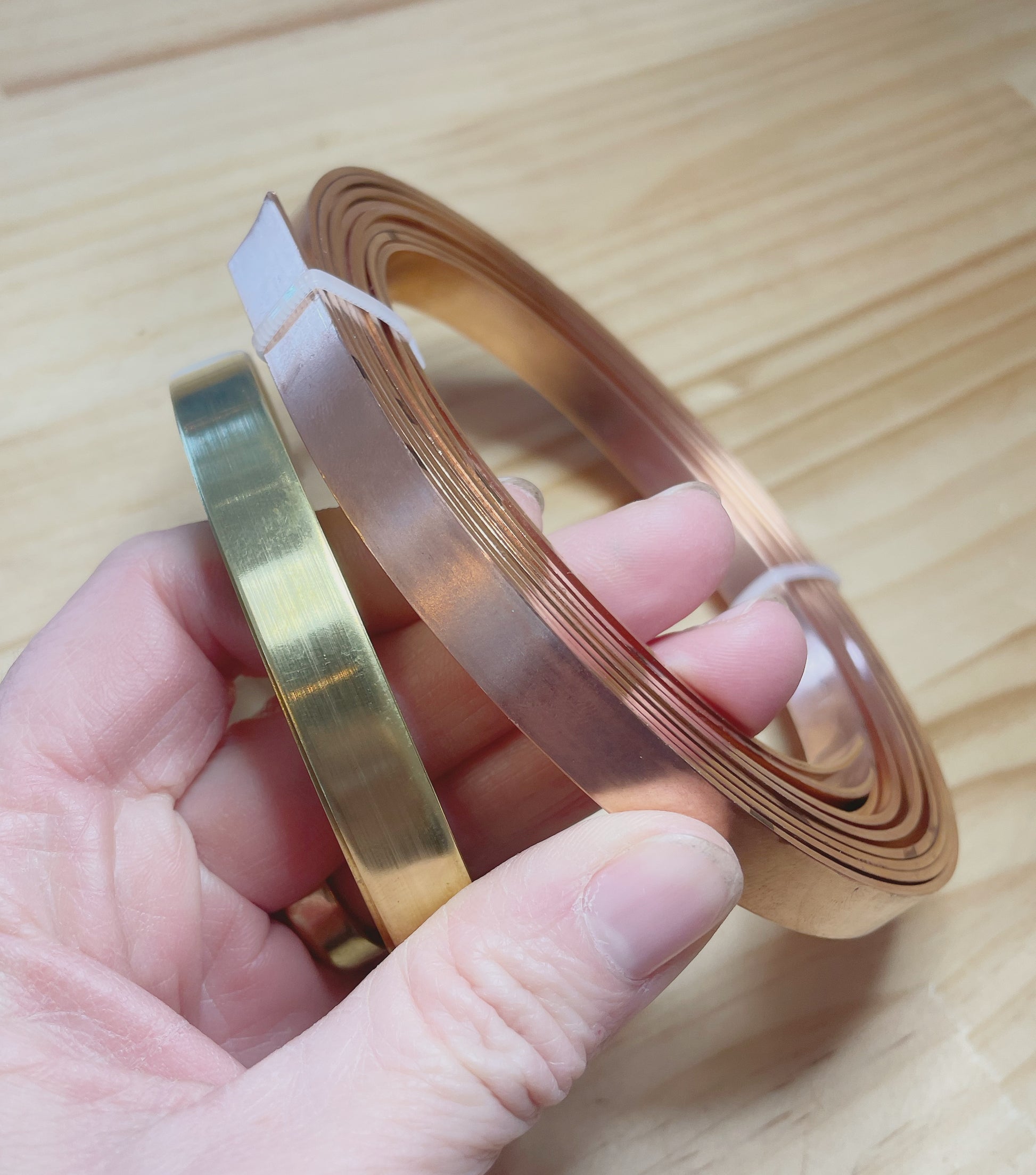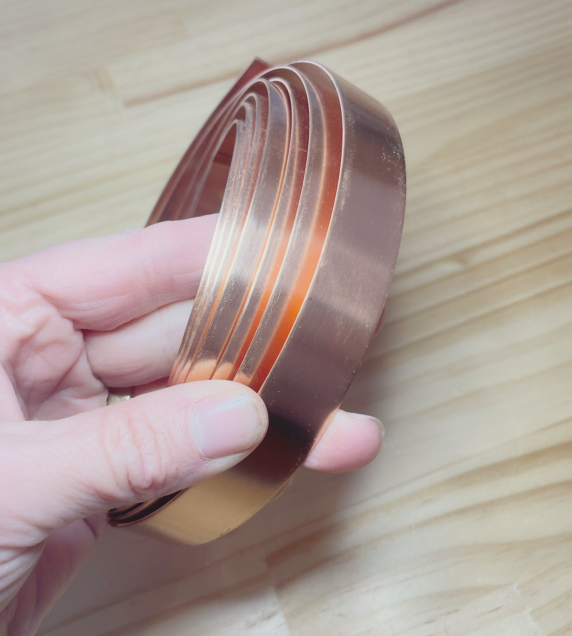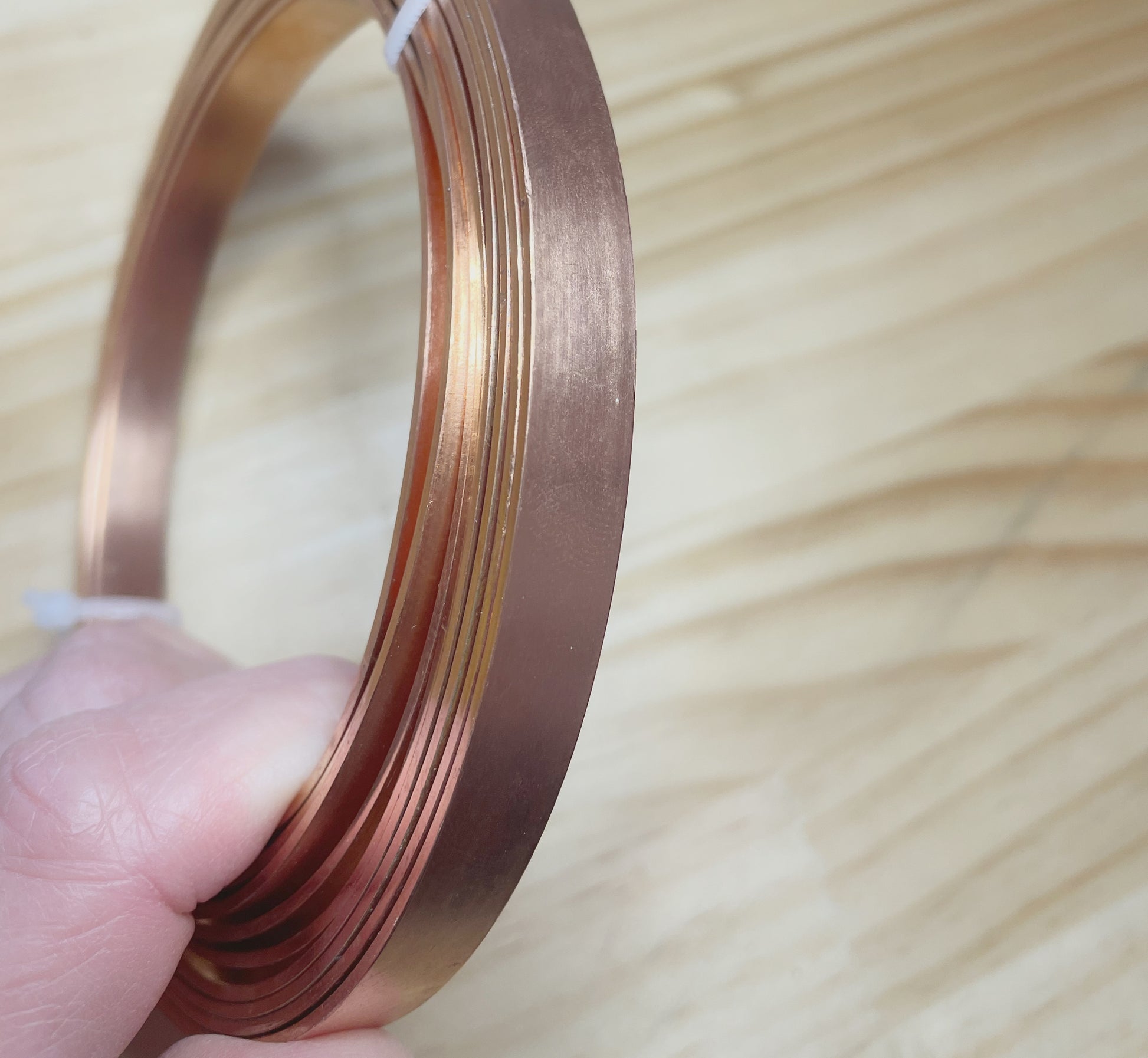 Copper – 1.5mm thick x 10mm wide, with a warm, earthy finish that develops a natural patina over time. Or 1mm thick x 20mm wide.