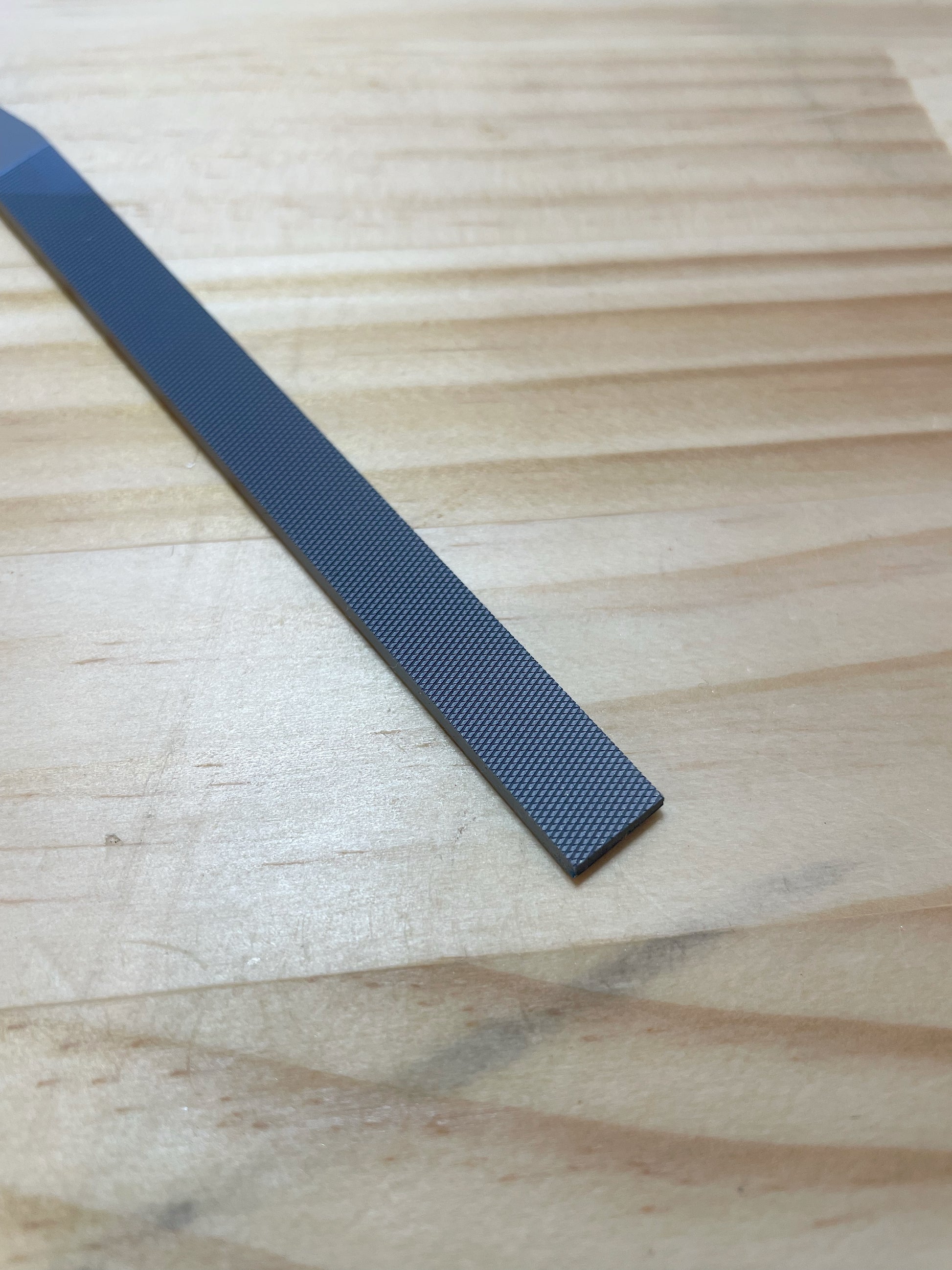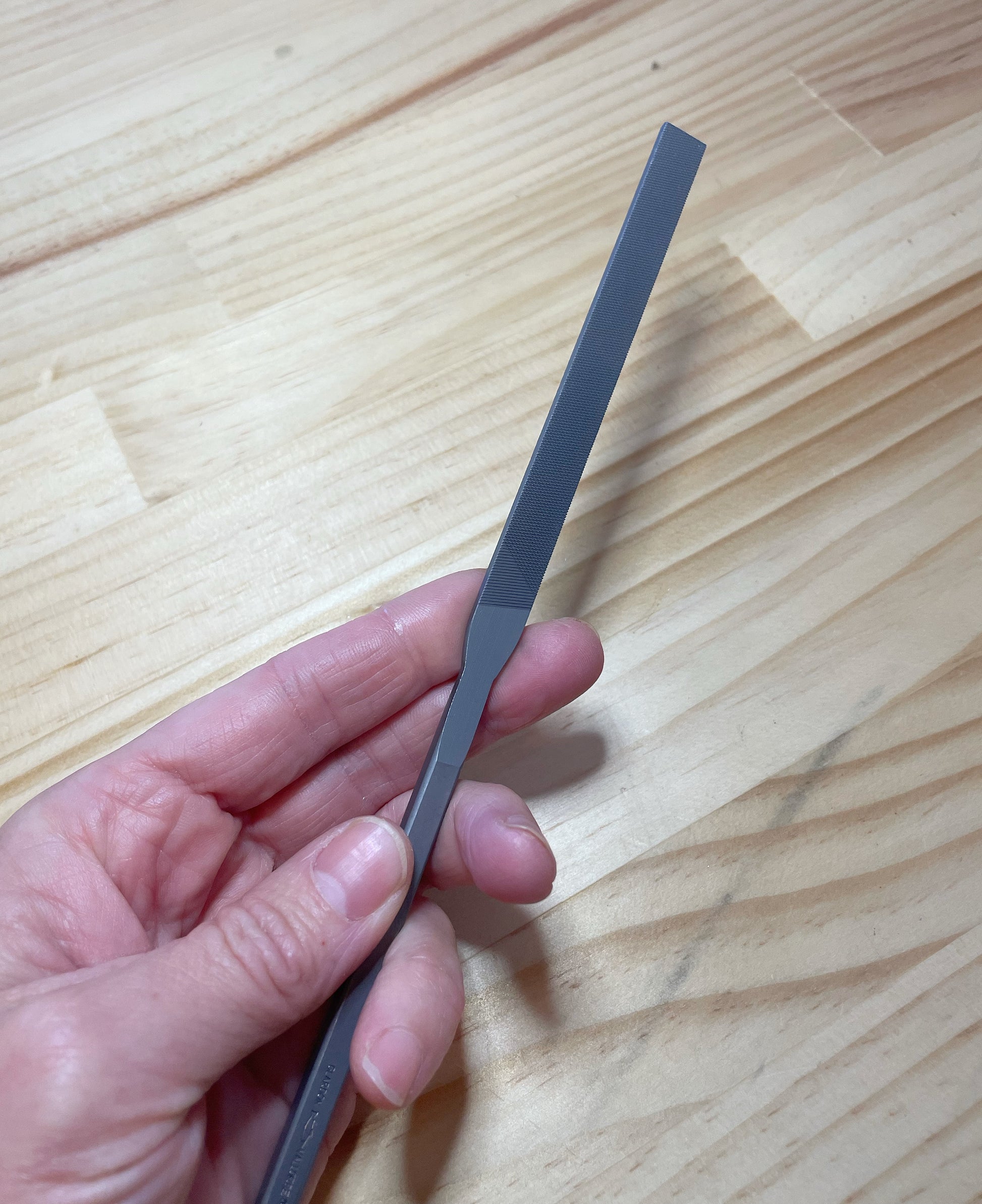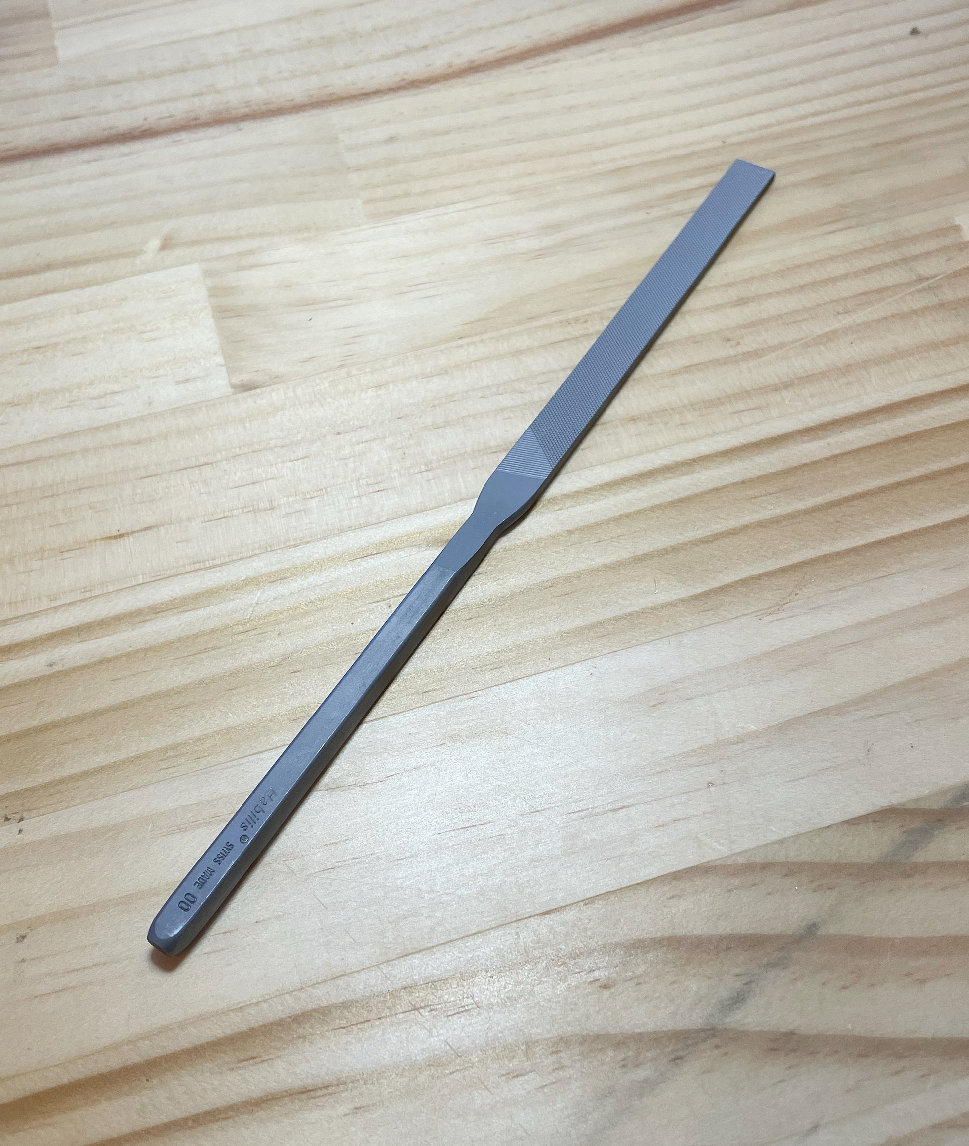 This slim flat file is made by Vallorbe in Switzerland, the gold standard for jewellery files. It is also known as a Pillar File.