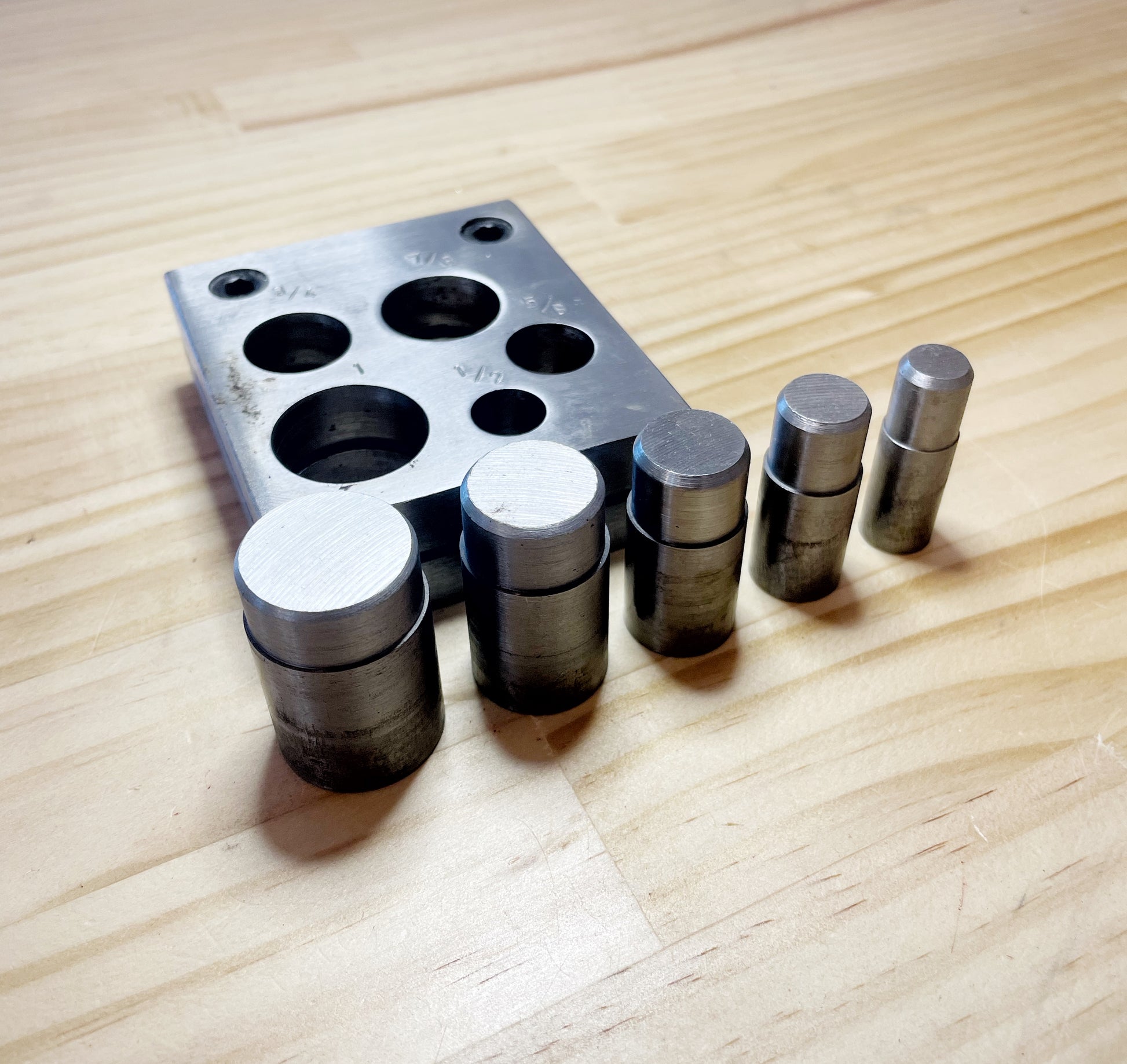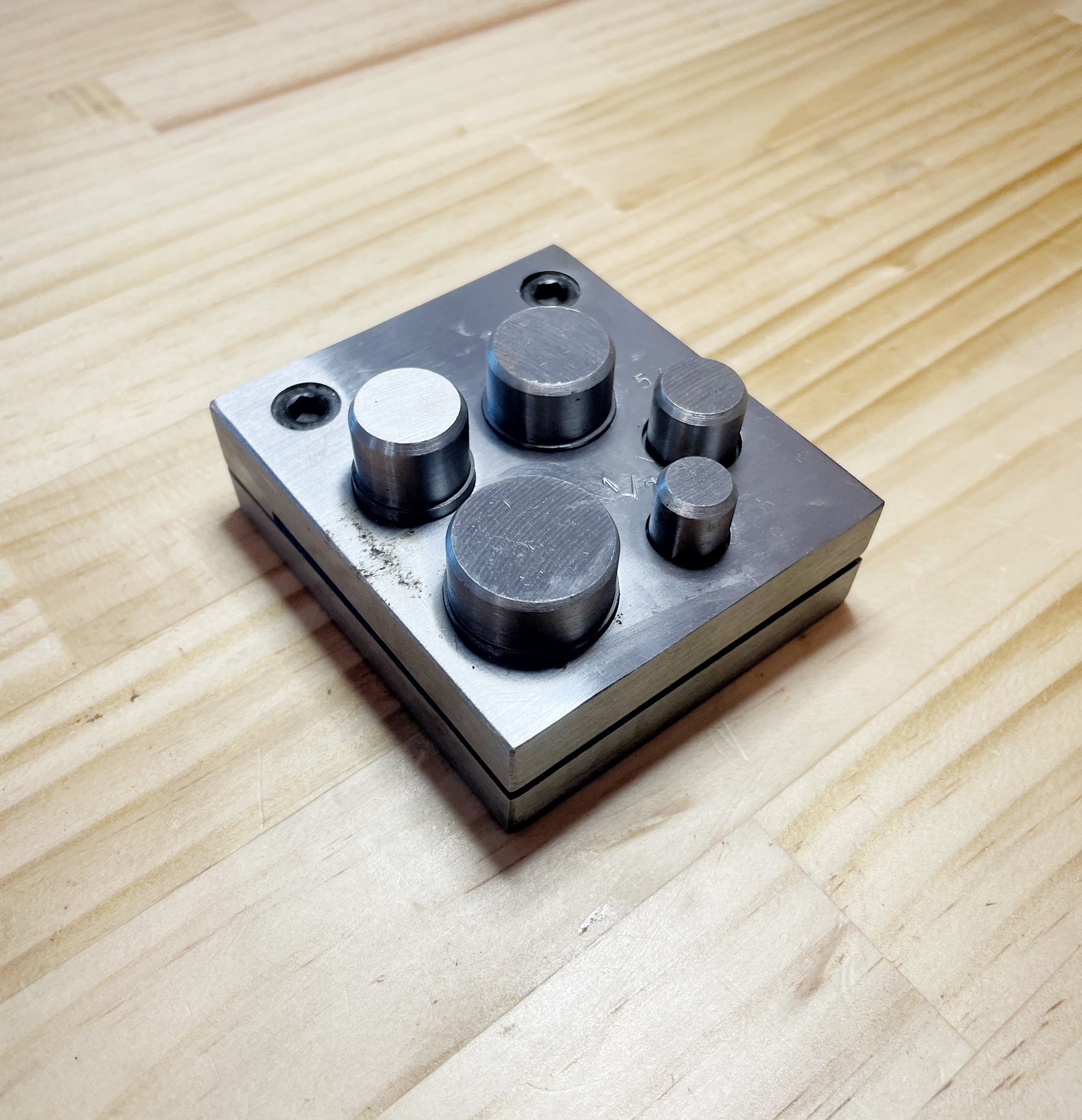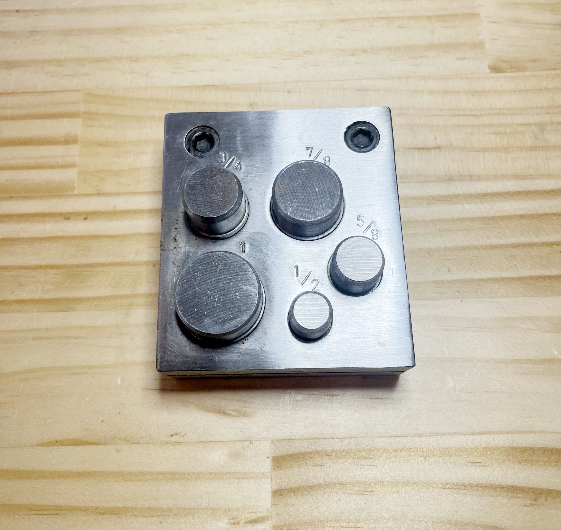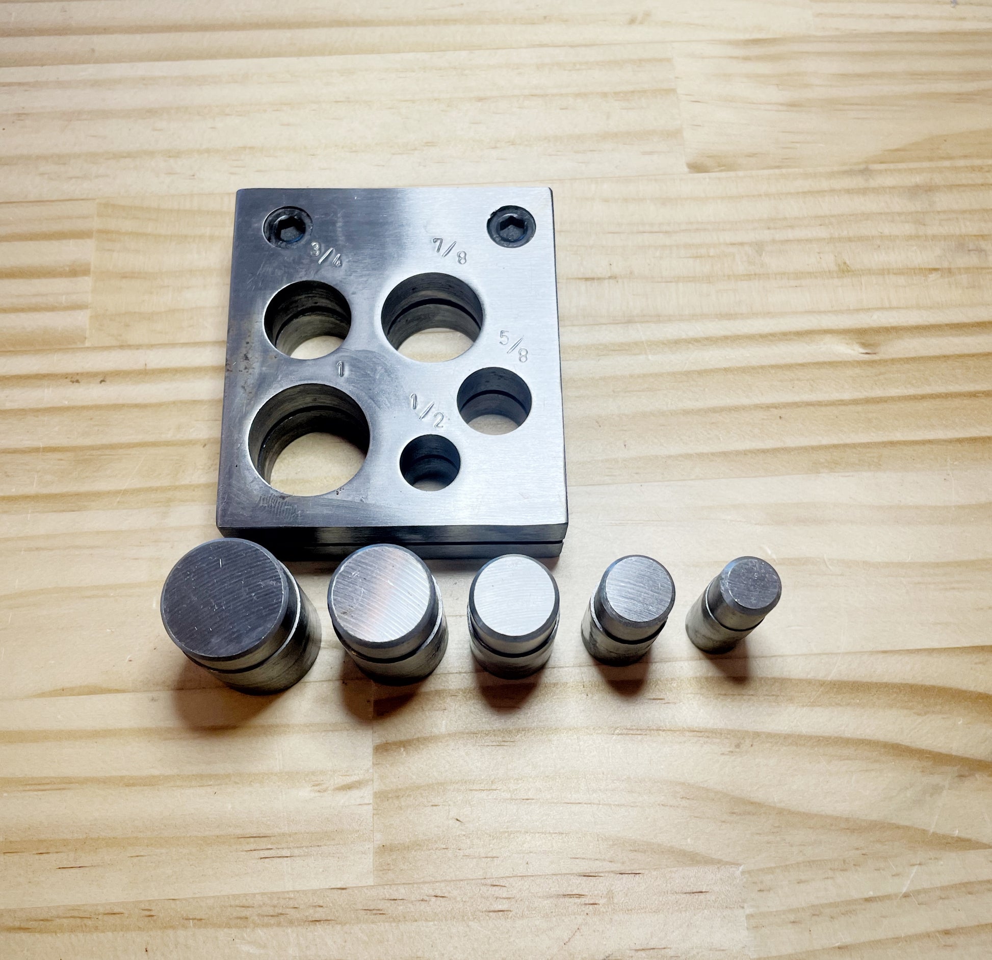 The solid steel block measures 35mm high x 70mm x 80mm and comes with five punch sizes: 12.7mm, 15.9mm, 19mm, 22.2mm, and 25.4mm.