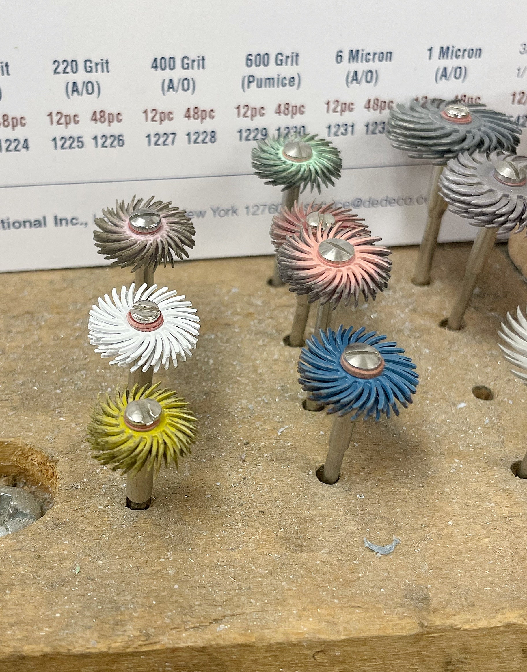 Sunburst® Radial Bristle Discs by Dedeco® are impregnated with a specially treated ceramic abrasive grain resulting in longer life and faster results requiring no polishing compound. Safer and more flexible than wire brushes. Radial Discs are long-lasting and cool running with operating speeds of 3,000 - 18,000 RPM. Lower speeds allow a softer touch, greater flexibility and more subtle results. Higher speeds provide more aggressive material removal. Use a single disc for tight areas like slots and grooves or stack them for larger surface areas.