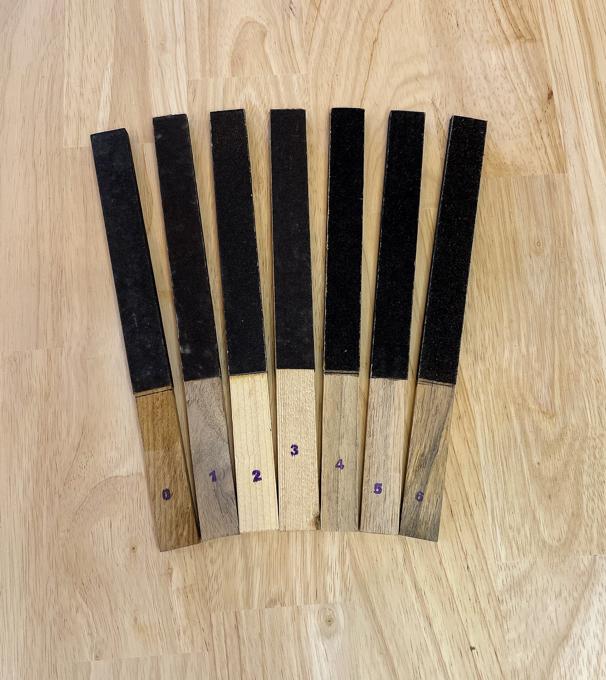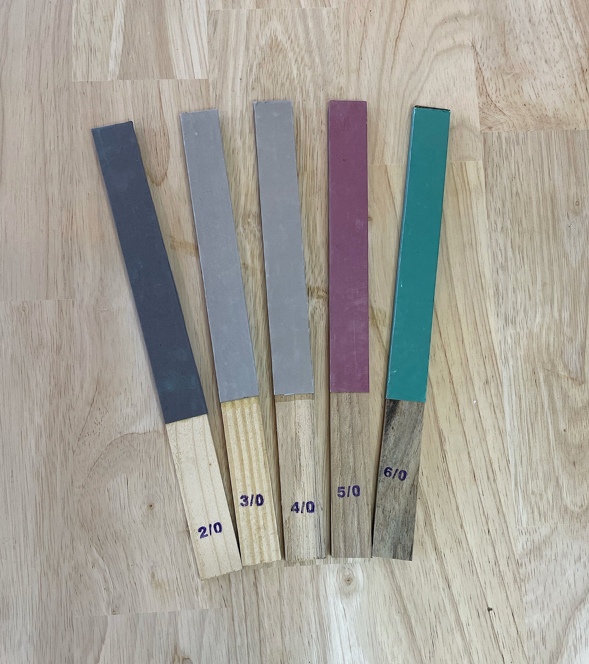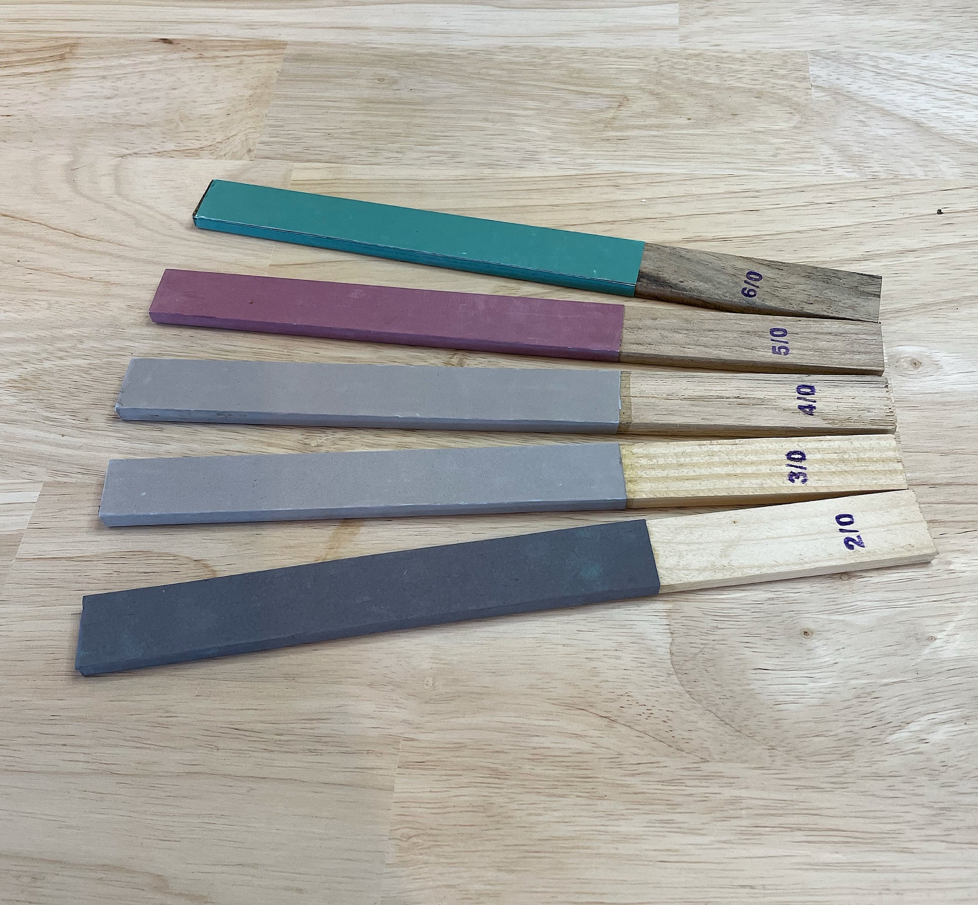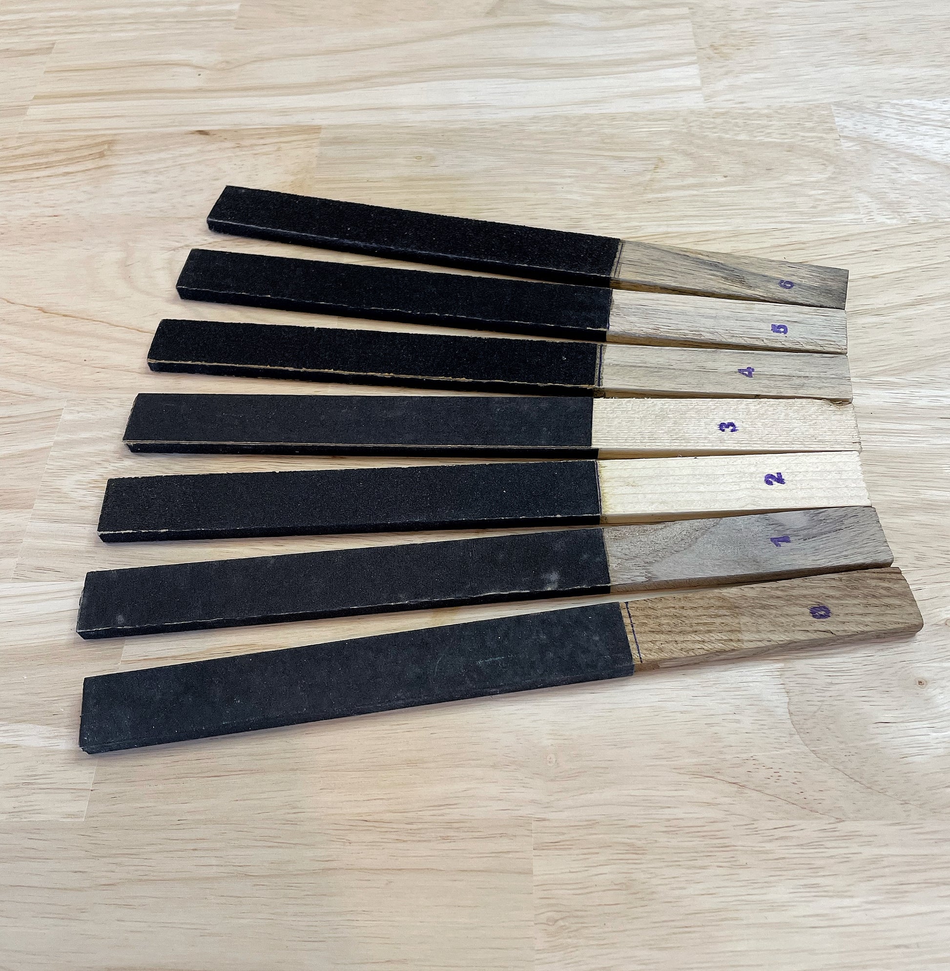 Economy wooden sanding sticks in a set of 13 grades, from 220 grit to 2000 grit.