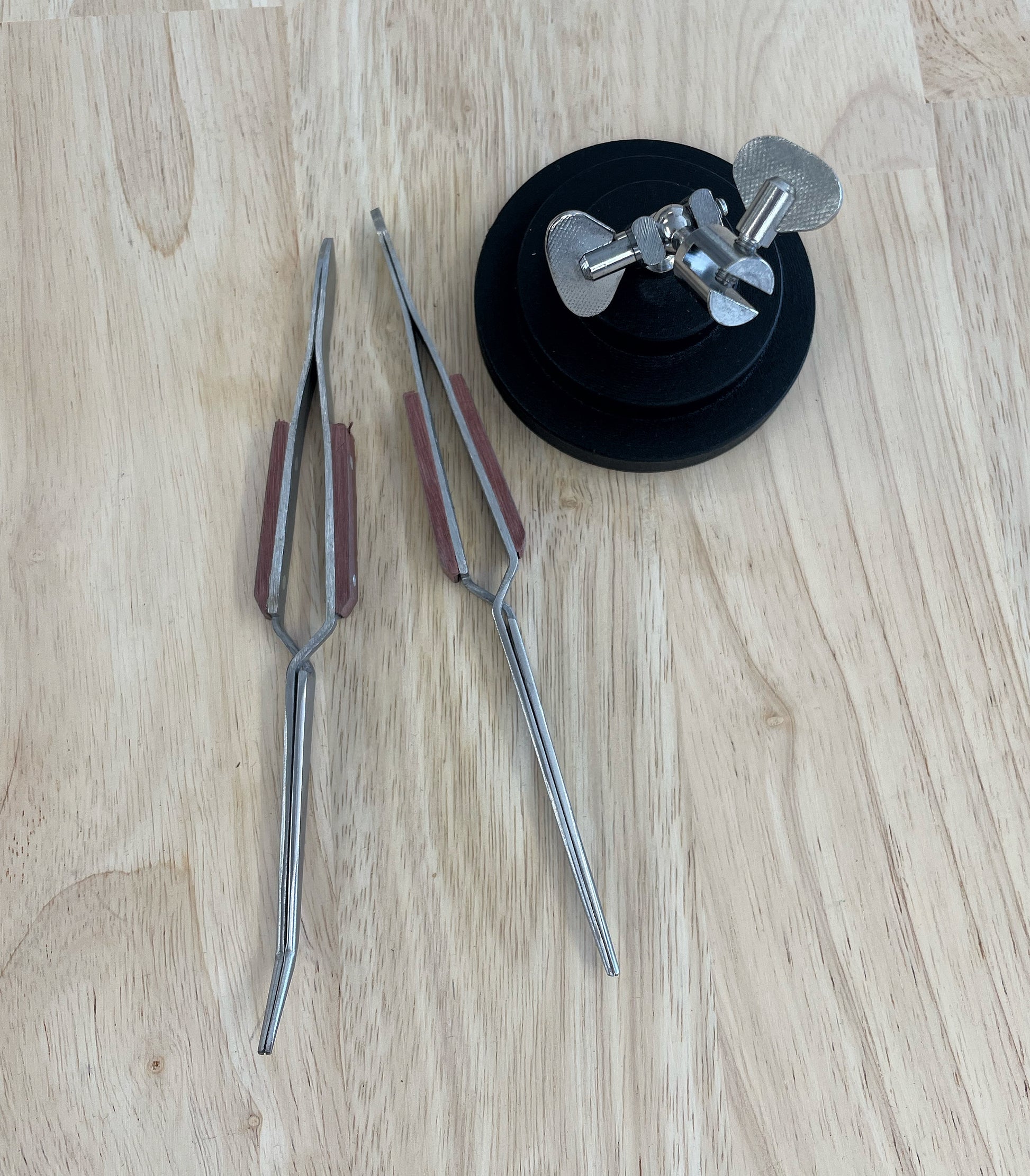 This handy set features the Third Hand and two pairs of cross locking tweezers, straight and curved. Cross locking means unlike regular tweezers, you squeeze them to open them, so they hold your piece tightly without needing to be held shut. The tweezers are 160mm long and have cool grip wooden handles.