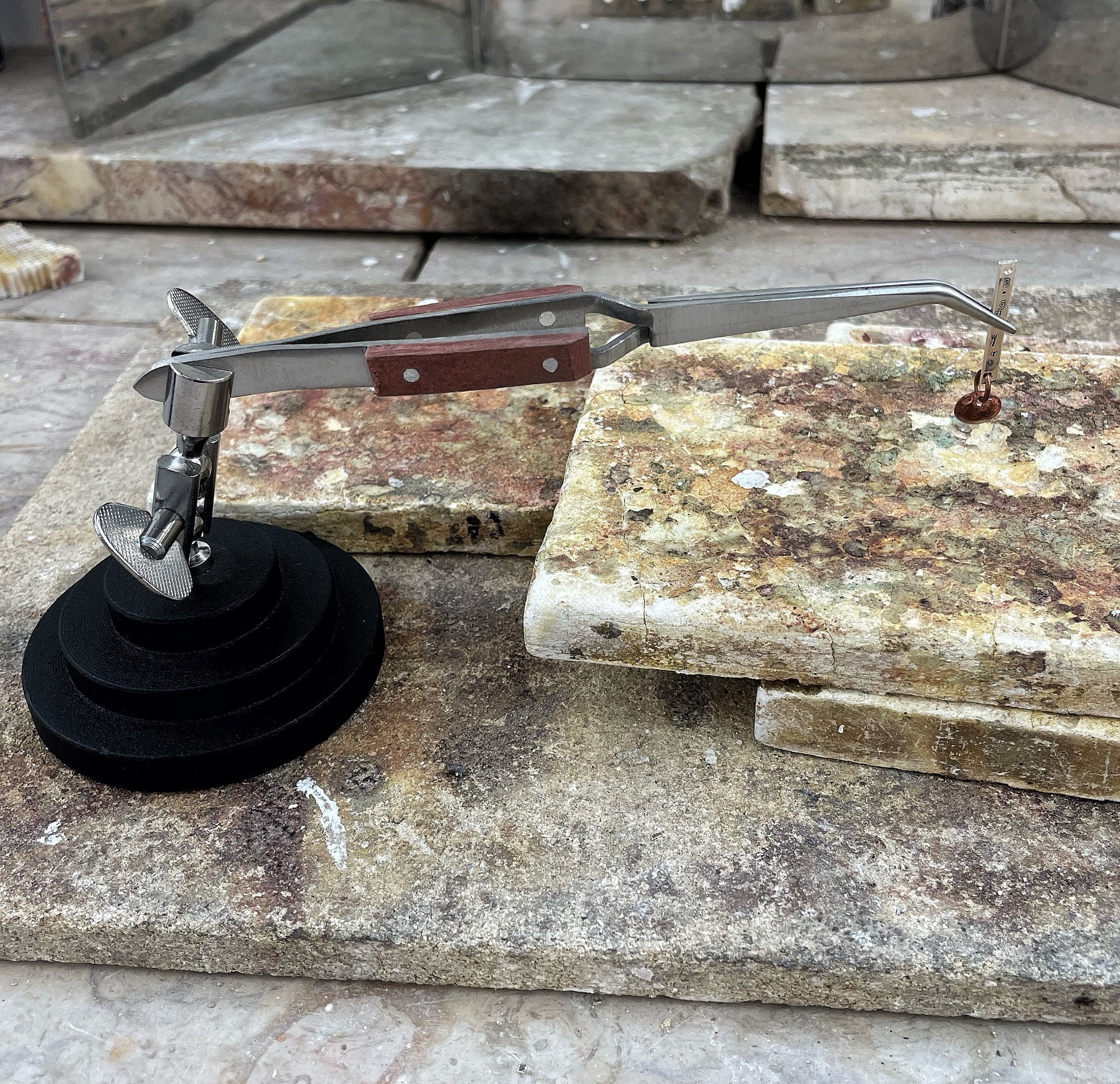 A Third Hand is a weighted metal base that has wingnuts and ball bearings to enable it to move in all directions. When you clamp a pair of tweezers in it you can use it to hold your jewellery while you solder, keeping everything in place!