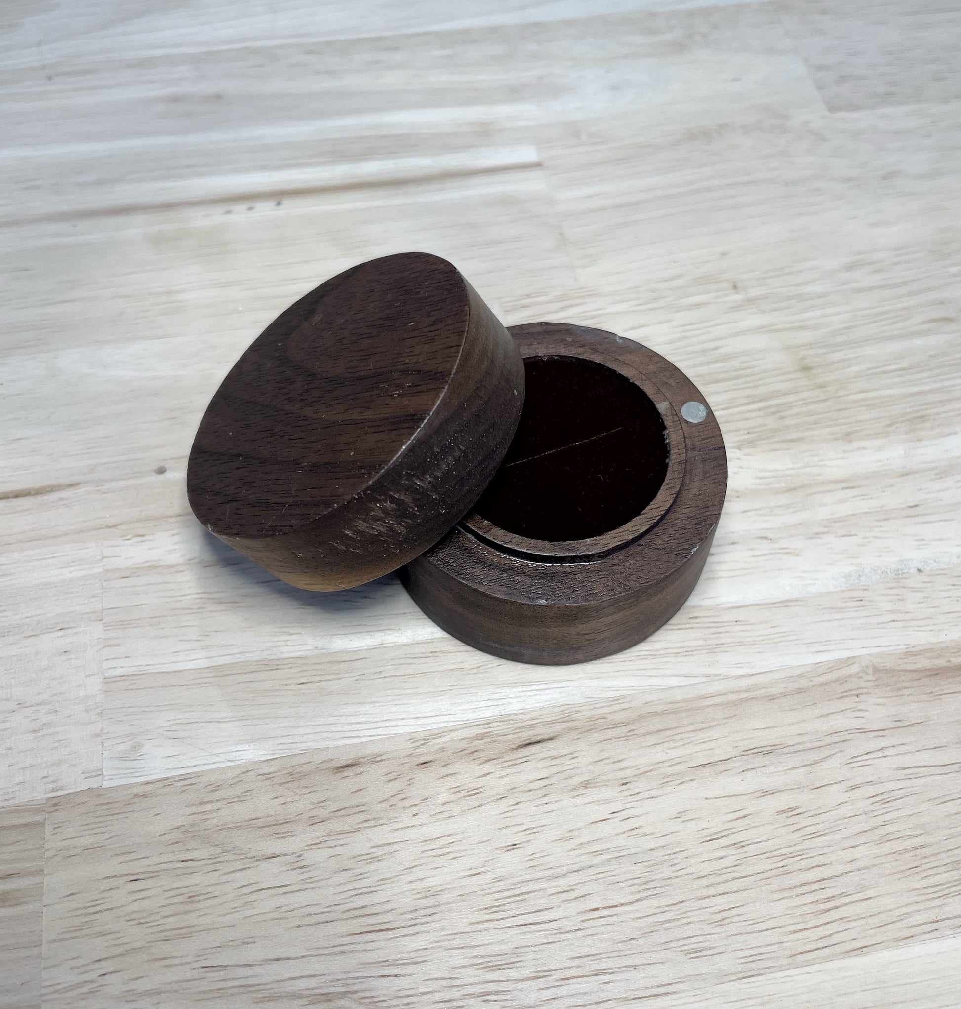 Circular Ring Box - a classic, with 2 magnetic closures and a soft velvet interior. It is 52mm in diameter x 35mm high.