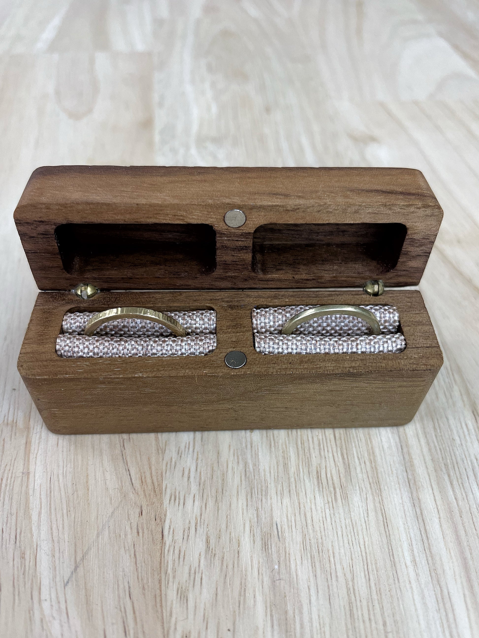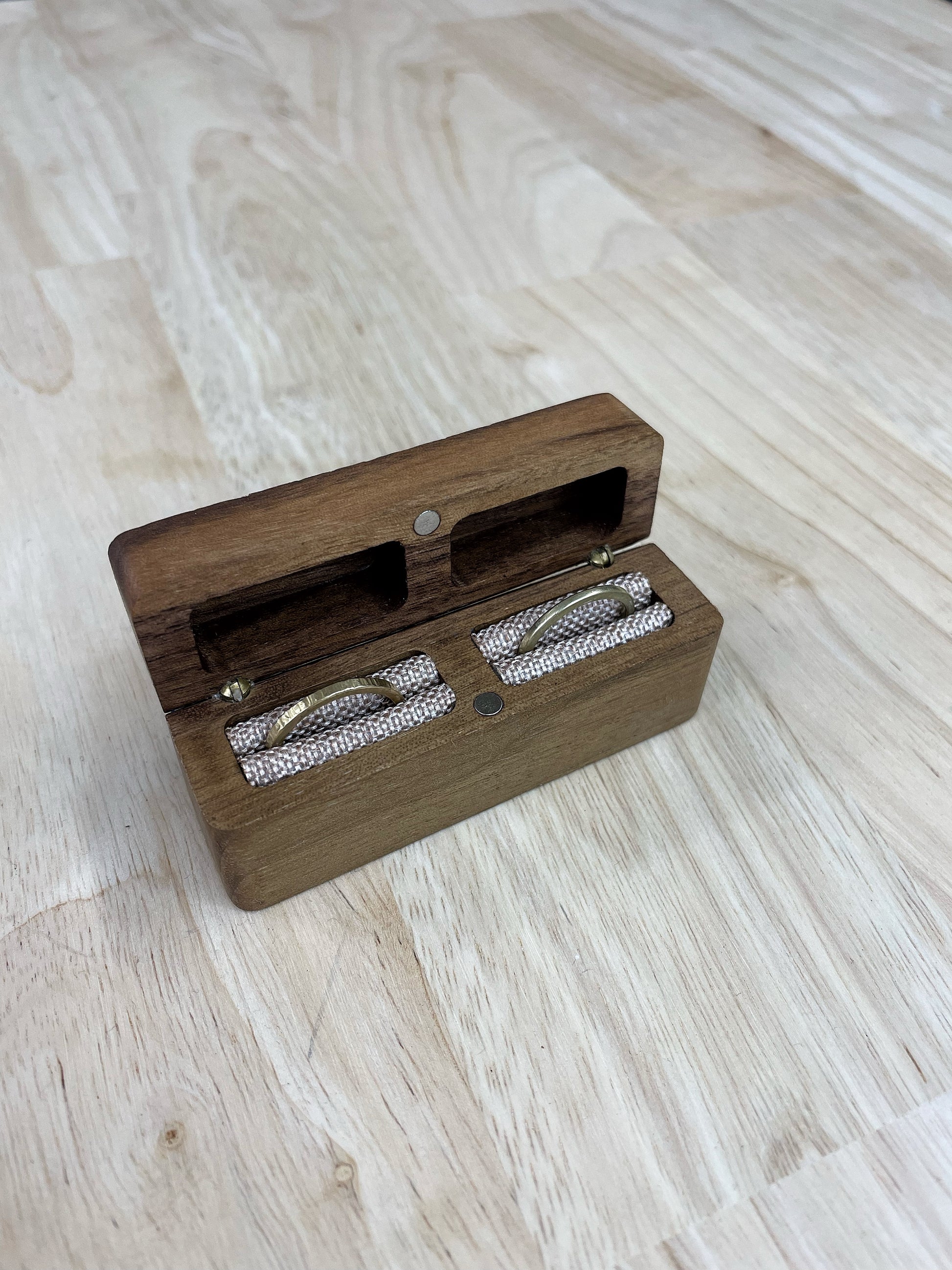 Double Ring Box - this flat box has space for two rings, ideal for wedding ceremonies! It has a hinged lid with a magnet and measures 85mm x 30mm x 40mm. The ring slots have cotton supports and are 35mm wide.