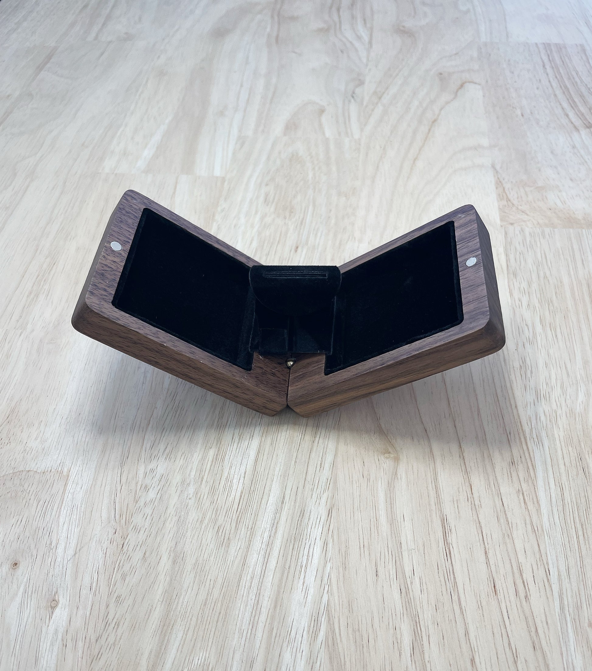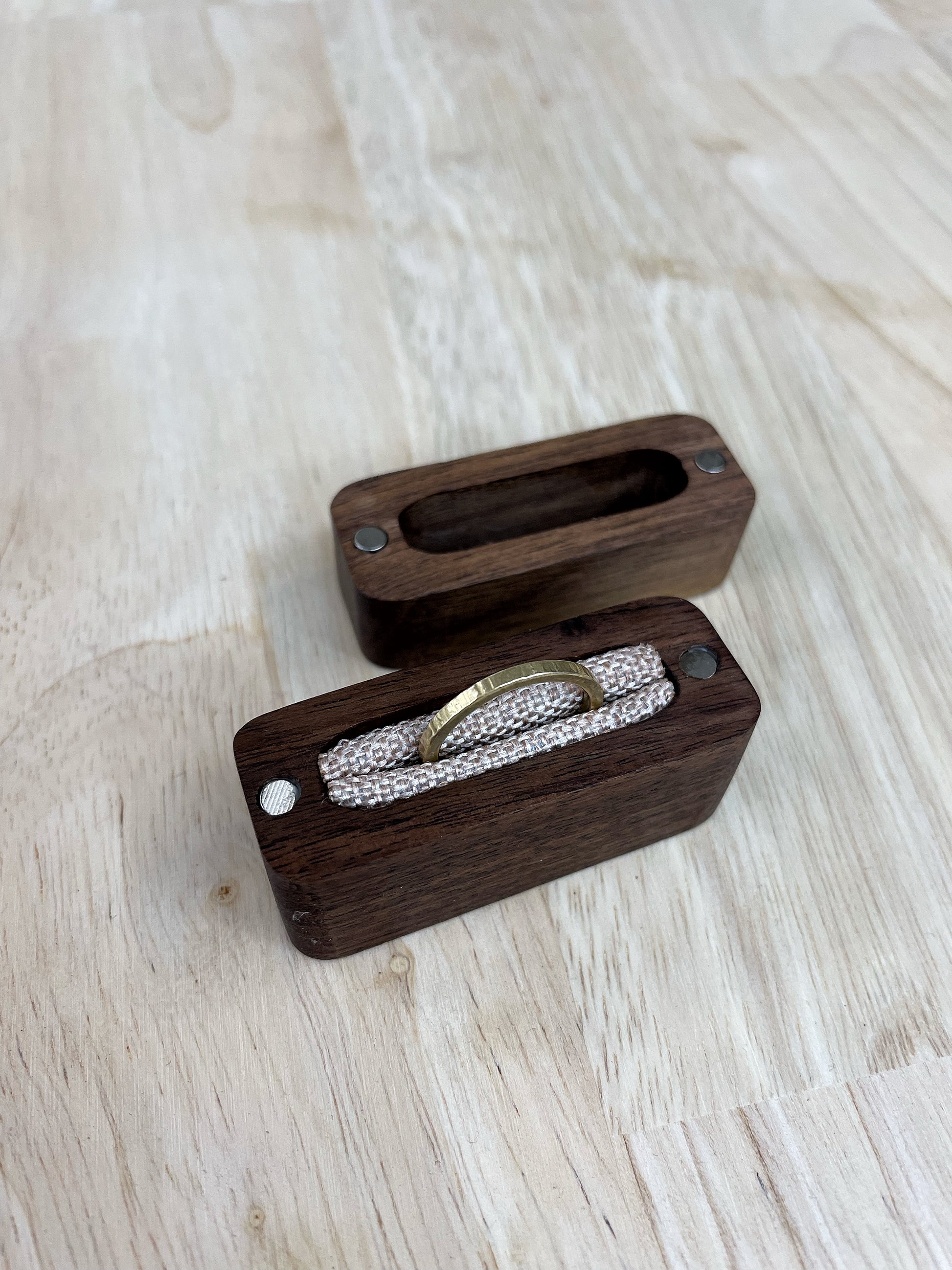 Flat Ring Box - perfect for a proposal, this box is nice and flat to fit in a pocket. It has a double magnet closure and measures 54mm x 20mm x 36mm . The ring slot has cotton supports and is 37mm wide.