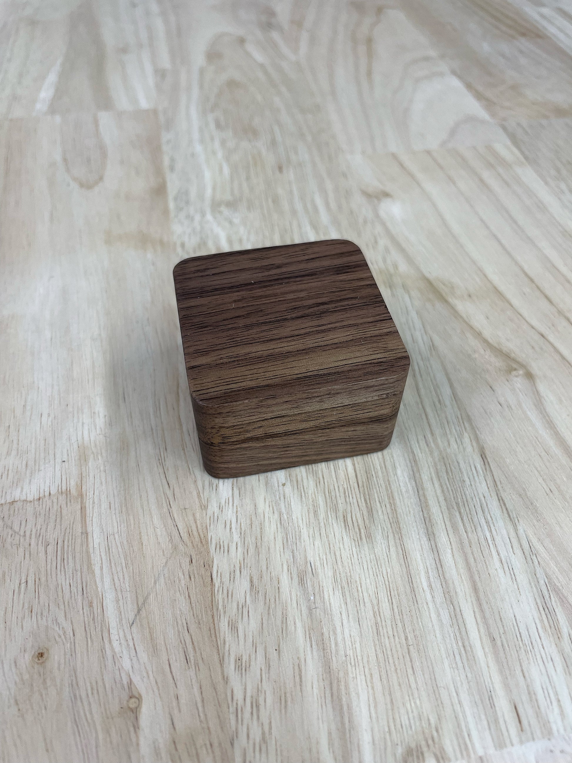 Square Ring Box - a classic box with black velvet interior, hinged lid and a magnet to snap closed. It measures 48mm x 48mm x 31mm.